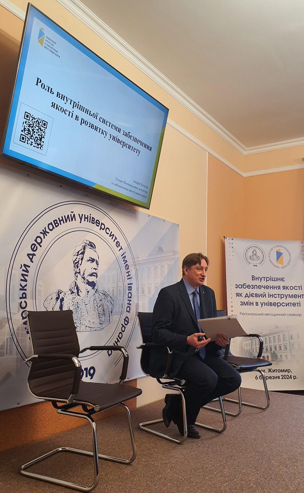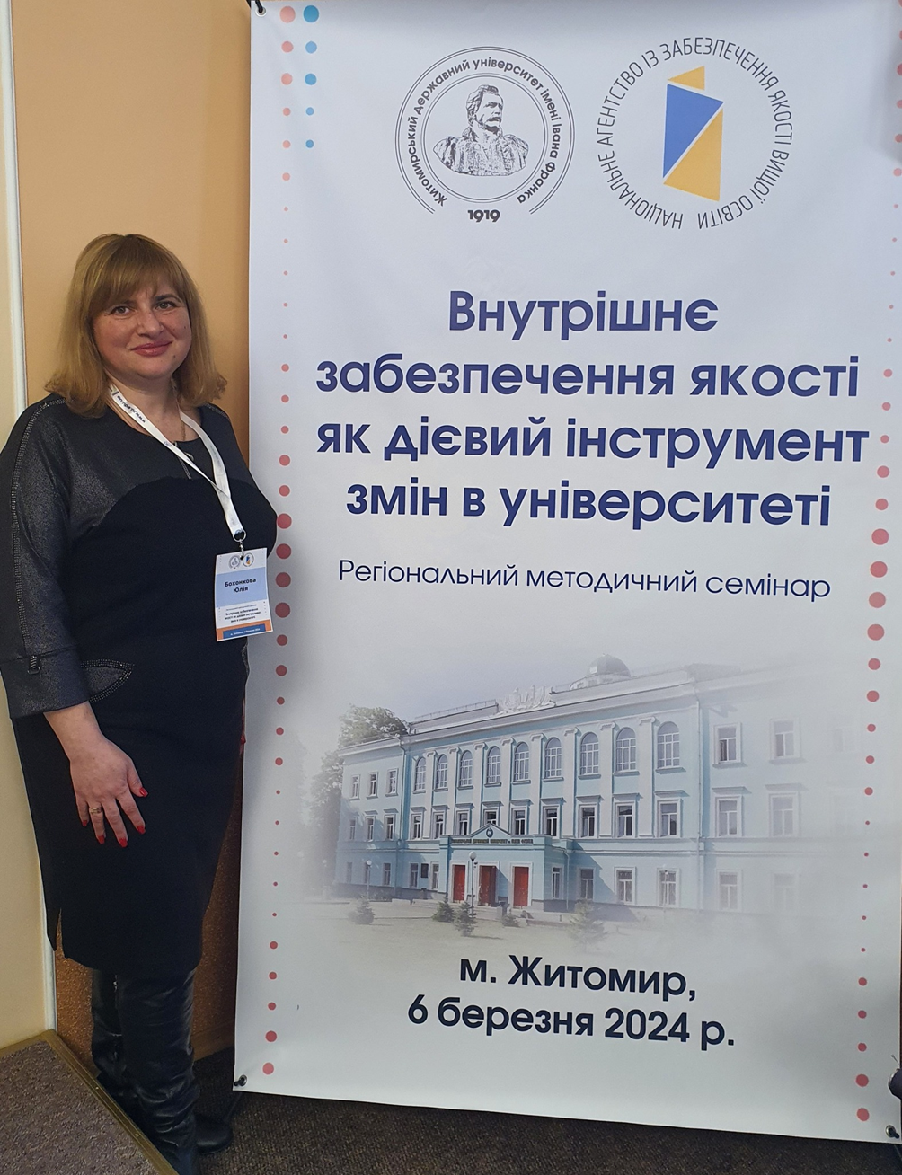 6 березня 2024 року делегація Східноукраїнського національного університету імені Володимира Даля у складі: Людмили Володіної, керівниці центру забезпечення якості освітньої діяльності та якості вищої освіти, Юлії Бохонкової, доктора психологічних наук, професорки, завідувачки кафедри психології та соціології, Ольги Семенець, кандидата філологічних наук, завідувачки кафедри іноземної філології та перекладу, Лариси Лелюх, начальниці відділу профорієнтації, відвідали регіональний методичний семінар на тему «Внутрішнє забезпечення якості як дієвий інструмент змін в університеті», який було проведено на базі Житомирського державного університету імені Івана Франка (м. Житомир) Національною агенцією із забезпечення якості вищої освіти (НАЗЯВО). Семінар зібрав учасників з багатьох закладів вищої освіти різних регіонів України. Згідно із заявленою програмою, було презентовано доповіді на дуже важливі теми, а саме: Роль внутрішньої системи забезпечення якості в розвитку університету (А. Бутенко), Постакредитаційний моніторинг та Європейський вектор розвитку української вищої освіти (Н. Стукало), Виклики реалізації інституційних політик внутрішніх систем забезпечення якості у ЗВО (О. Єременко), Використання AI та Big Data для підвищення якості викладання та навчання (на прикладі галезей 05 та 07) (О. Длугопольський). У другій частині семінару присутні ознайомились із презентаціями кращих практик із реалізації внутрішніх систем забезпечення якості вищої освіти на прикладі Житомирського державного університету імені Івана Франка та Державного університету «Житомирська політехніка», які є дуже корисними задля використання у власній професійній діяльності.