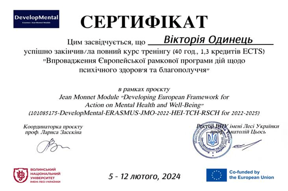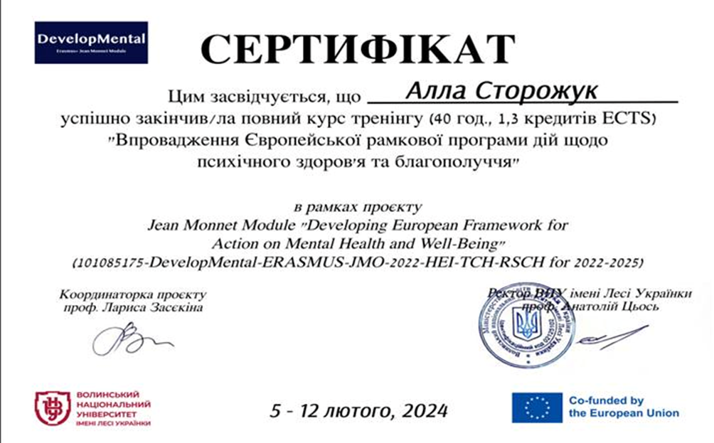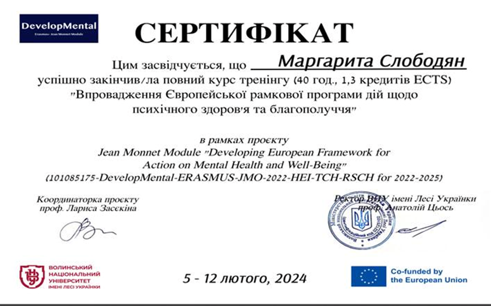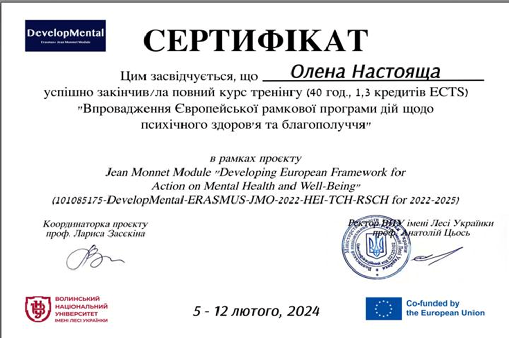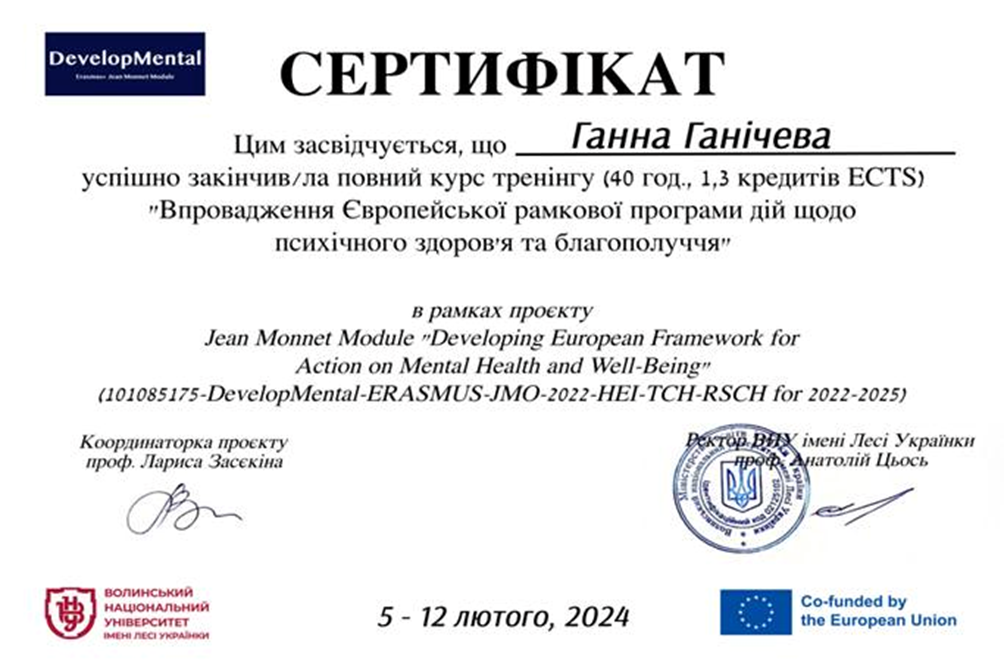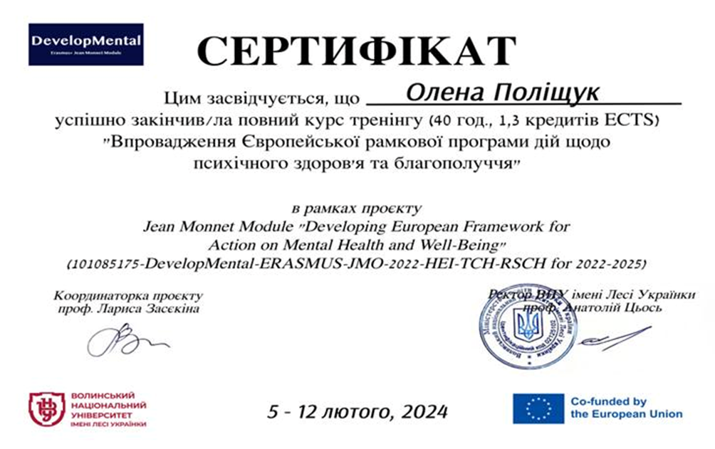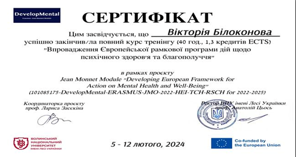 Здобувачі вищої освіти спеціальності 053 Психологія освітньої програми «Психологія» кафедри психології та соціології факультету здоров’я людини успішно завершили навчання за програмою DevelopMental із впровадження ЄС стандартів в систему охорони психічного здоров’я на тему: «Впровадження Європейської рамкової програми дій щодо психічного здоров’я та благополуччя» програми Жана Моне. Проєкт поєднує в собі й основні тенденції Європейських студій, і досвід ЄС у зміцненні громадського психічного здоров’я. Навчання відбувалось з 5 по 12 лютого 2024 року. Організатори – кафедра загальної та клінічної психології Волинського національного університету імені Лесі Українки. Координатор – доктор психологічних наук, професорка Лариса Засєкіна.