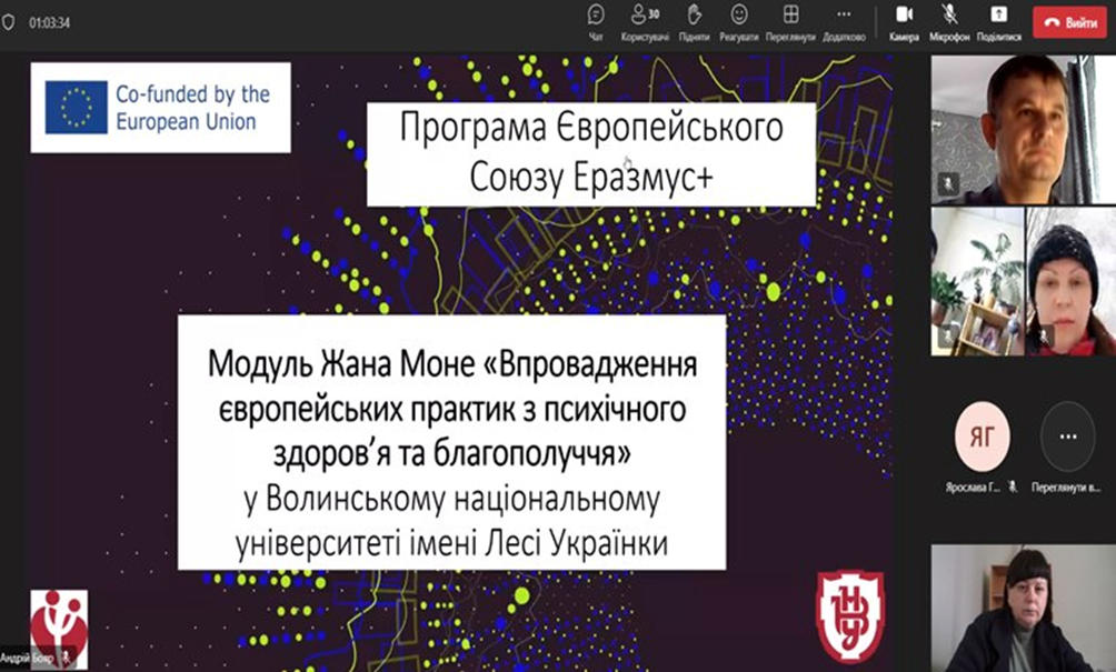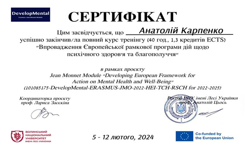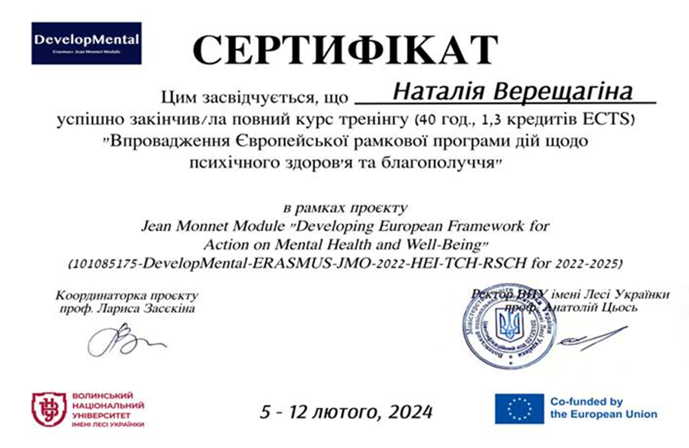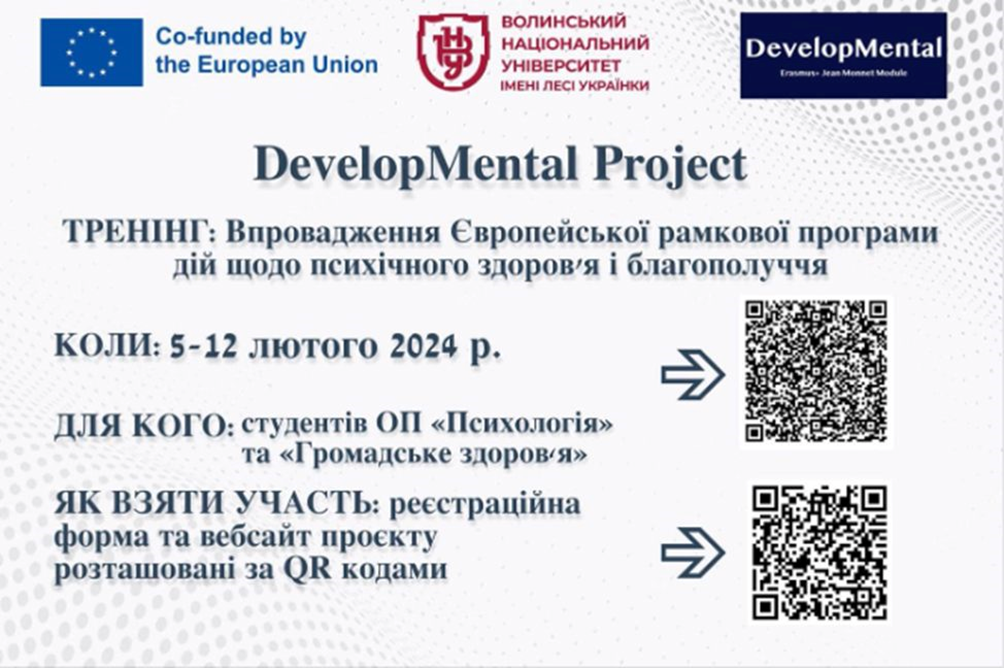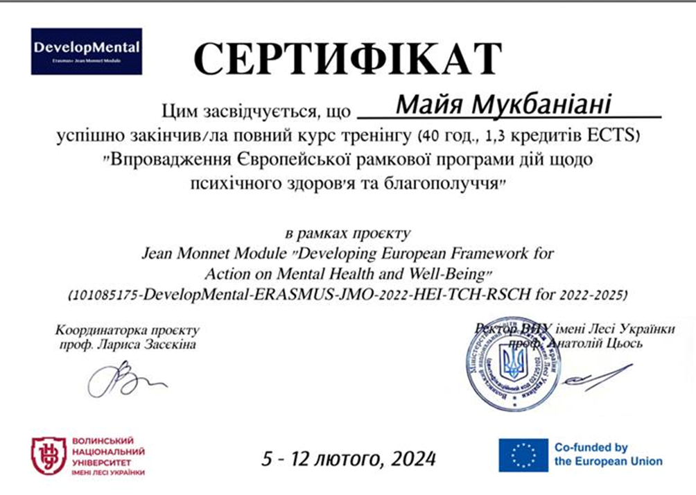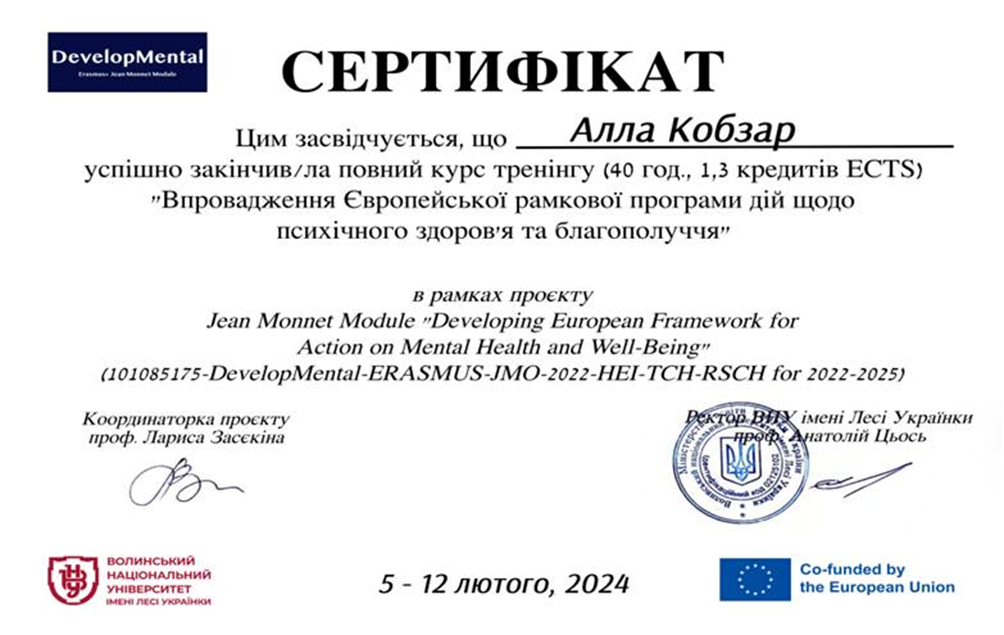 Здобувачі вищої освіти спеціальності 053 Психологія освітньої програми «Психологія» кафедри психології та соціології факультету здоров’я людини успішно завершили навчання за програмою DevelopMental із впровадження ЄС стандартів в систему охорони психічного здоров’я на тему: «Впровадження Європейської рамкової програми дій щодо психічного здоров’я та благополуччя» програми Жана Моне. Проєкт поєднує в собі й основні тенденції Європейських студій, і досвід ЄС у зміцненні громадського психічного здоров’я. Навчання відбувалось з 5 по 12 лютого 2024 року. Організатори – кафедра загальної та клінічної психології Волинського національного університету імені Лесі Українки. Координатор – доктор психологічних наук, професорка Лариса Засєкіна.