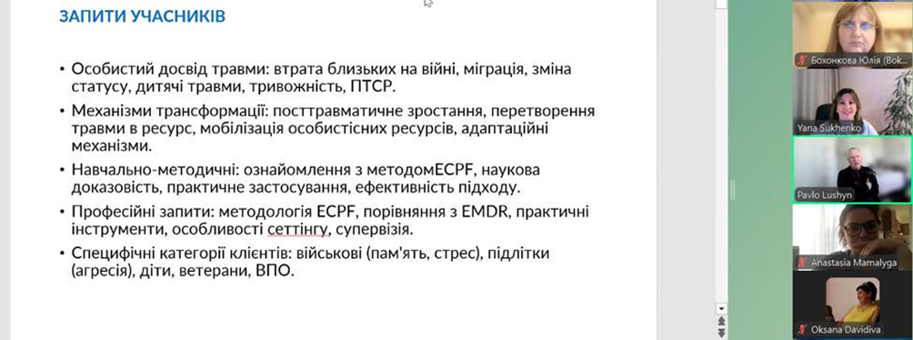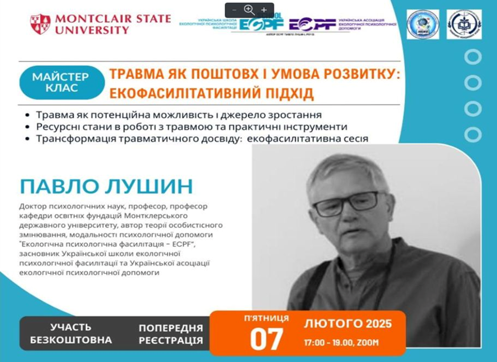 7 лютого 2025 року викладачі кафедри психології та соціології разом із здобувачами вищої освіти освітньої програми "Психологія" другого (магістерського) та третього (освітньо-наукового) рівнів прийняли участь у майстер класі "Травма як поштовх і умова розвитку: екофасилітативний підхід". Ведучий майстер класу: Павло Лушин, доктор психолологічних наук, професор кафедри освітніх фундацій Монтклерського державного університету (США), автор Української модальності психологічної допомоги "Екологічна психологічна фасилітація – ECPF", засновник Української школи екопсихологічної фасилітації та Української асоціації екологічної психологічної допомоги. Кофасилітаторка: Я.В. Сухенко, к.психол.н., професорка кафедри психології та особистісного розвитку ДЗВО "Університет менеджменту освіти", психологиня, ECPF-викладачка, супервізорка.
