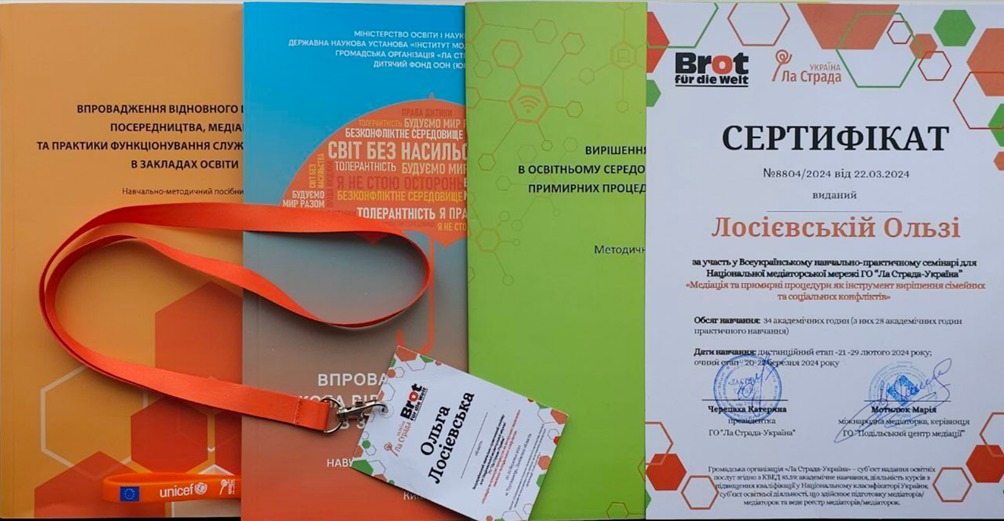 Представники Університетського центру медіації Східноукраїнського національного університету імені Володимира Даля Ольга Лосієвська (членкіня Національної медіаторської мережі ГО «Ла Страда-Україна», доктор психологічних наук, професорка, професорка кафедри психології та соціології) та Володимир Мороз (член молодіжної медіаторської мережі ГО «Ла Страда-Україна», здобувач вищої освіти другого (магістерського) рівню спеціальності 053 Психологія, освітньої програми «Психологія») були запрошені 20-22 березня 2024 р. на Всеукраїнський семінар для представників та представниць Національної медіаторської мережі ГО «Ла Страда-Україна», який проводиться в рамках проєкту “Попередження ґендерно зумовленого насильства, торгівлі людьми та порушення прав дитини” за підтримки донорської організації “Хліб для світу”. Тема семінару: «Медіація та примирні процедури як інструмент вирішення сімейних та соціальних конфліктів». На Всеукраїнському навчально-практичному семінарі для Національної медіаторської мережі ГО «Ла Страда-Україна» практично відпрацьовувались навички вирішення сімейних конфліктів шляхом медіації, фасилітаційна медіація, екосистемна медіація, трансформативна медіація, медіація у громадах. Окремим блоком вдосконалювались навички роботи по соціальній згуртованісті: проводилось професійне обговорення та напрацьовувались інструменти щодо посилення ролі особистості та спроможності громад в досягненні миру та порозуміння. Участь у даному заході стала можливою в межах підписаного меморандуму про співпрацю та взаємодію між кафедрою психології та соціології та ГО «Ла Страда-Україна».