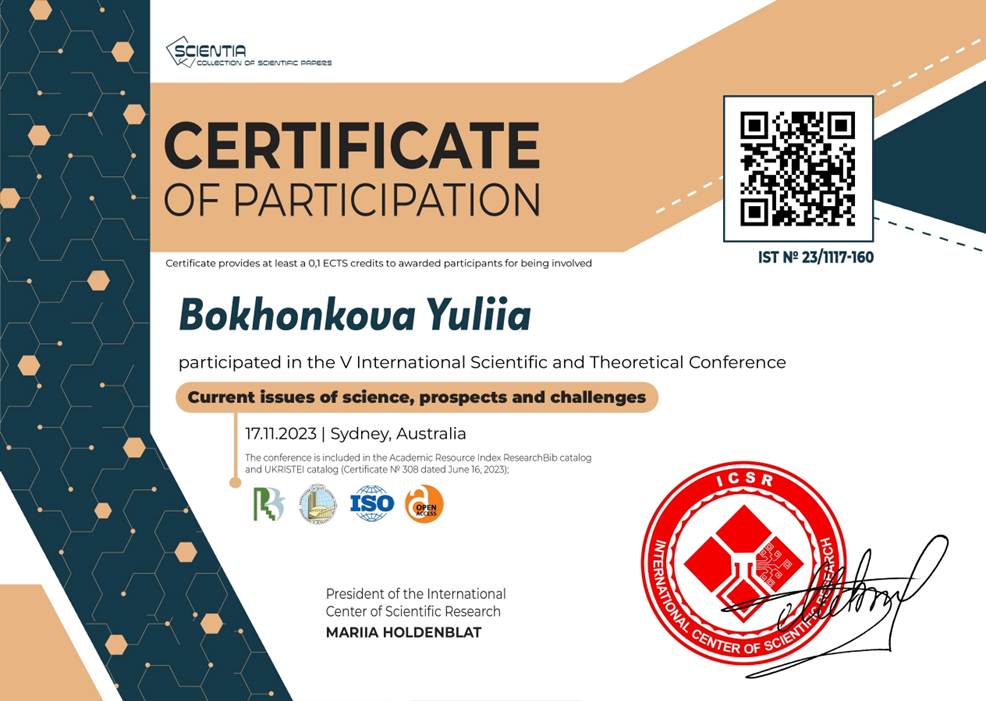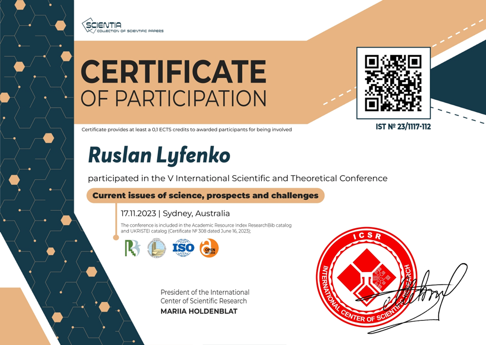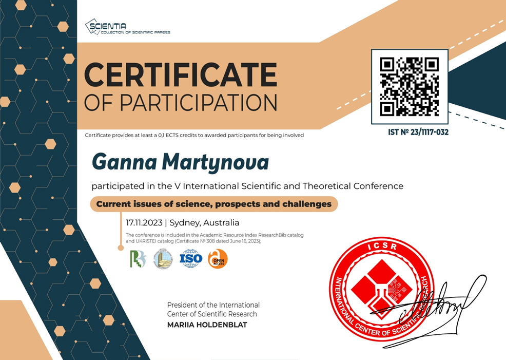 Результати участі в міжнародній конференції "Current issues of science, prospects and challenges" ("Актуальні проблеми науки, перспективи та проблеми")