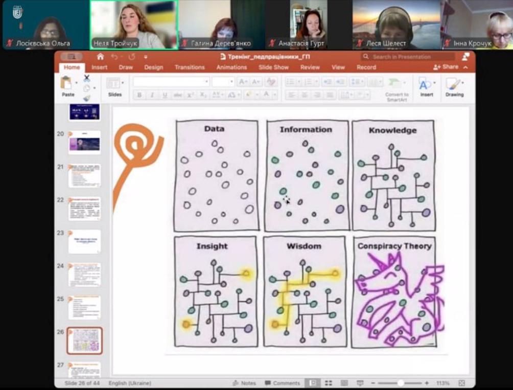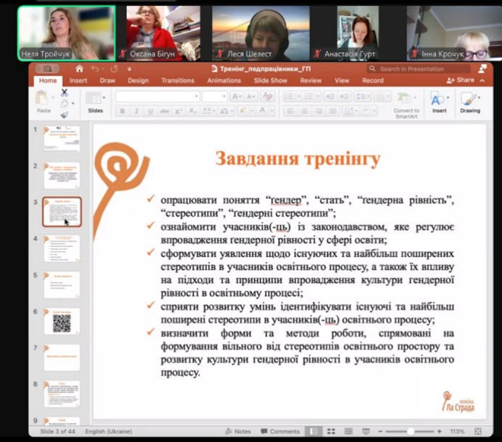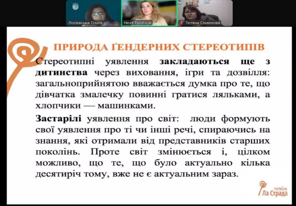 Здобувачі вищої освіти спеціальності Психологія, освітньої програми «Психологія» разом із викладачами кафедри психології та соціології факультету здоров’я людини відвідали сертифікований онлайн-тренінг "Ґендерна просвіта", який реалізовується в рамках проєкту «Попередження ґендерно зумовленого насильства, торгівлі людьми та порушення прав дитини» за підтримки донорської організації «Хліб для світу» та ГО «Ла Страда-Україна». Тренерка – Неля Тройчук, психологиня, засновниця і керівниця ГО "ПсихоСоціальне Благополуччя і Захист". Під час тренінгу присутні ознайомились з особливостями: