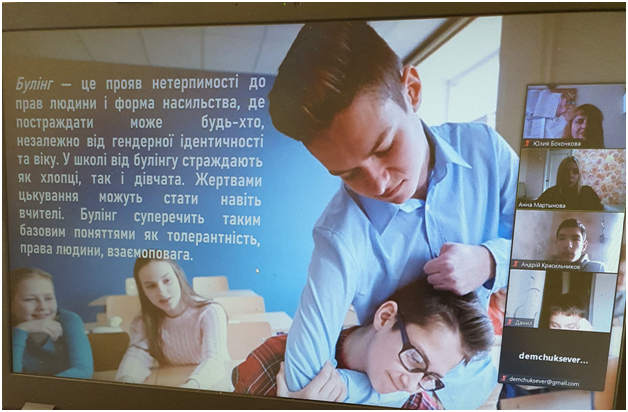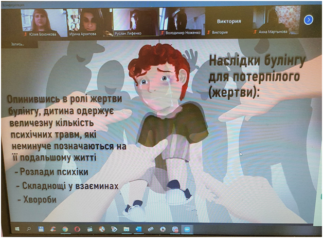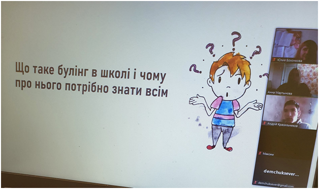 05 листопада 2021 року за ініціативою здобувачів вищої освіти четвертого курсу спеціальності 053 Психологія кафедри психології та соціології Лифенком Русланом, Архіповою Іриною, Мартиновою Ганною та Кривогузом Кирилом зі школярами випускних класів середньої загальноосвітньої школи I - III ступенів № 6 м. Сєвєродонецьк проведено виховний захід на тему "Зупинимо булінг разом". Мета заходу - ознайомити школярів із поняттям "булінг", сформувати власне відношення до цього неприємного та агресивного явища, вміти розрізняти поведінку під час булінгу та ситуаційного конфлікту. Булінг (bullying, від анг. bully - хуліган, забіяка, задирака, грубіян, насильник) — це форма психічного насильства у вигляді тиску, дискримінації, цькування, бойкоту, дезінформації, псування особистих речей, фізичної розправи. Ця тема була обрана для семінару-тренінгу у зв'язку із тим, що майже 38% підлітків в Україні ставали жертвами булінгу, за визначенням UNICEF. Школярам надано практичні рекомендації щодо поведінки, якщо вони або їх оточуючи стали жертвами булінгу або свідками цькування, до кого треба відразу звертатись за порадами та допомогою. Це батьки, вчителі та психологи. Саме психологи мають достатню кількість інструментів, знань та навичок для виявлення, профілактики та протидії булінгу (цькуванню). Увагу присутніх було акцентовано на передбачене законом покарання за булінг - це штрафи або громадські роботи. Варто пам’ятати, що не можна заплющувати очі навіть на найменший прояв цькування, адже розібратися з ситуацією можна лише спільними зусиллями і тільки, якщо вчасно звернути на неї увагу.