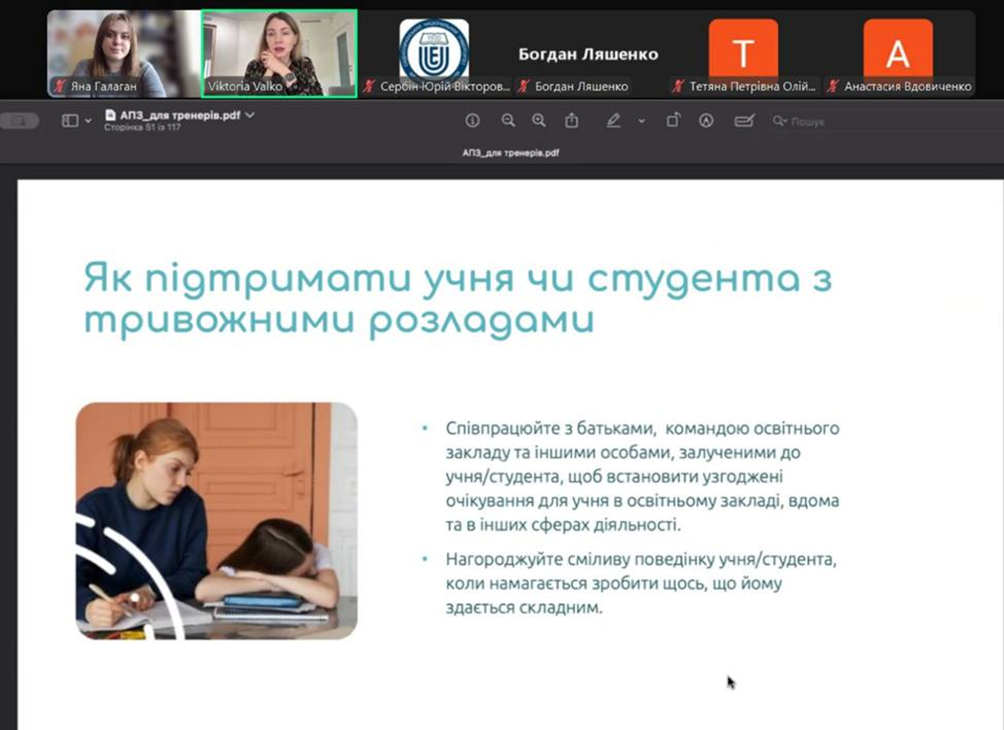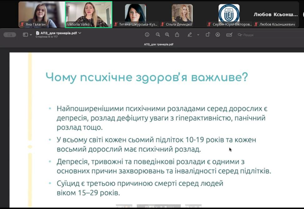 Викладачі та співробітники кафедри психології та соціології факультету здоров’я людини (Олена Пелешенко, Яна Галаган, Юрій Сербін) стали учасниками навчального курсу «Академія психічного здоров’я», реалізованого у рамках Національної програми ментального здоровʼя «Ти як?» Українським благодійним фондом «Коло сім’ї» та фондом Americares. Основна мета навчання – підвищення обізнаності фахівців (освітян, психологів) щодо поширених проблем у сфері психічного здоров’я молоді та дорослих. Було приділено увагу питанням поширеності таких проблем та розладів, як: ПТСР, пережиття втрати, депресія, тривожні розлади (фобії, панічні розлади, соціальні фобії, ОКР, ГТР), РХП, поведінкові розлади тощо. Увагу учасників привернули питання важливості вчасного скерування осіб за належною допомогою, локальні маршрути допомоги при поширених розладах, методи допомоги при поширених розладах в сфері психічного здоров’я молоді та дорослих: сучасні рекомендації протоколів, шляхи психологічного супроводу в освітньому просторі тощо.