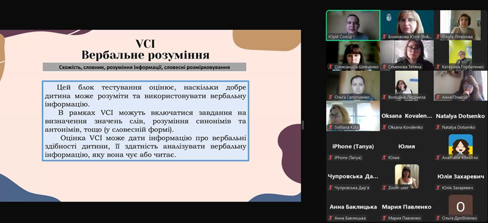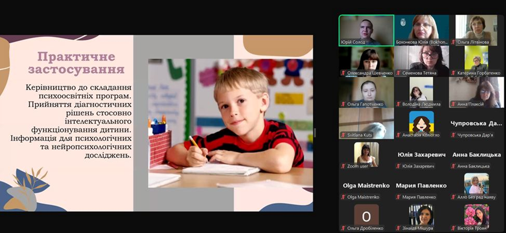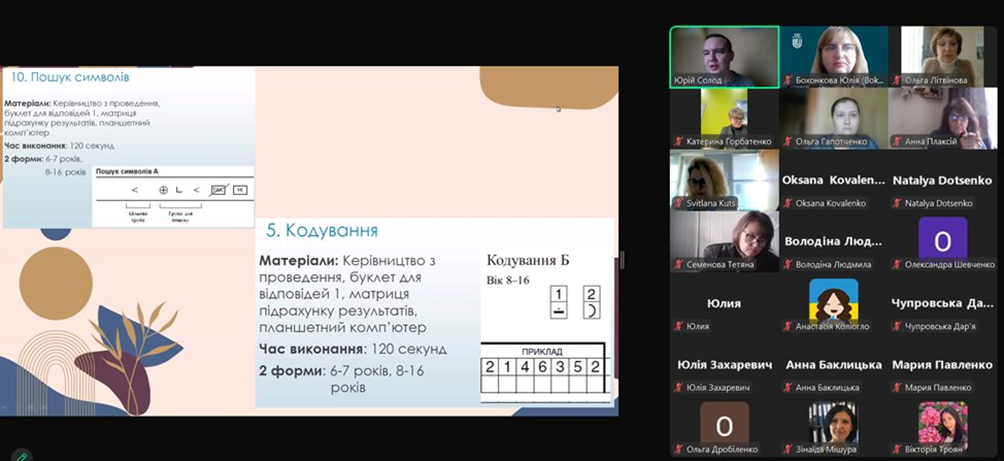 28 жовтня 2024 року на запрошення колег з кафедри психології, педагогіки та філософії Кременчуцького національного університету імені Михайла Остроградського (завідувачка кафедри – Ольга Літвінова) здобувачі вищої освіти спеціальності 053 Психологія освітньої програми «Психологія» кафедри психології та соціології факультету здоров’я людини Східноукраїнського національного університету імені Володимира Даля (завідувачка кафедри- Юлія Бохонкова) відвідали вебінар від психолога Комунального закладу Інклюзивно-ресурсний центр «Надія» Відділу освіти, молоді та спору виконавчого комітету Омельницької сільської ради Кременчуцького району Полтавської області Юрія Солода. Тема вебінару «Використання тесту Векслера в психологічній діагностиці когнітивних здібностей дитини». Тест Векслера – це вагомий інструмент, що використовується для діагностики загальних інтелектуальних здібностей дитини. Це «золотий стандарт» психодіагностики. Саме такі тести надають можливість визначитись де саме відстає у розвитку дитина. Доповідач ділився зі слухачами власним досвідом використання тесту, розповідав про особливості стимульного матеріалу загалом, і кожного субтесту зокрема, труднощами, які можуть виникати під час його проведення, правилами і вимогами до написання звіту за результатами тестування. Психологи повинні мати дані інструменти у власній професійній валізці.