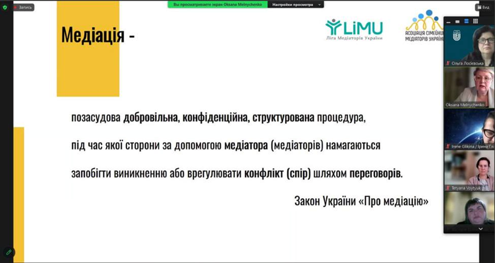 Відбулось чергове засідання Університетського центру медіації (керівник – Ольга Лосієвська), що працює на базі кафедри психології та соціології. 20 травня 2024 року для здобувачів вищої освіти, що навчаються за спеціальністю 053 Психологія (освітньою програмою «Психологія») кафедри психології та соціології факультету здоров’я людини, фахівчинями з сімейної медіації, членкинями Асоціації Сімейних Медіаторів України, було проведено навчальний вебінар "Особливості медіації як базової соціальної послуги". Спілкування під час вебінару поглибило розуміння сімейної медіації як соціальної послуги. Було розглянуто особливості сімейної медіації як законодавчо систематизованого явища, порядок отримання та надання даної соціальної послуги, порядок обрання медіатора. Висвітлено способи вибору медіаторів. Надано інформацію про отримання допомоги з медіації у найближчому центрі надання безоплатної вторинної правової допомоги. Фахівчині з сімейної медіації на вебінарі допомагали розібратися як процедура медіації допомагає батькам дізнатись, що саме непокоїть дитину, як запобігти зайвим переживанням дитини, сприяти мінімізації психологічного травмування дітей, бути певненими, що потреби дитини враховано, зберегти емоційний контакт з дитиною, налагодити діалог та конструктивно вирішувати питання, які стосуються дитини.