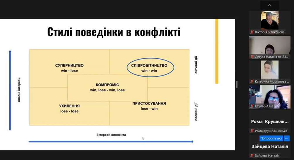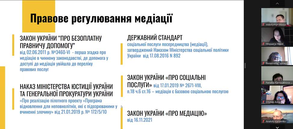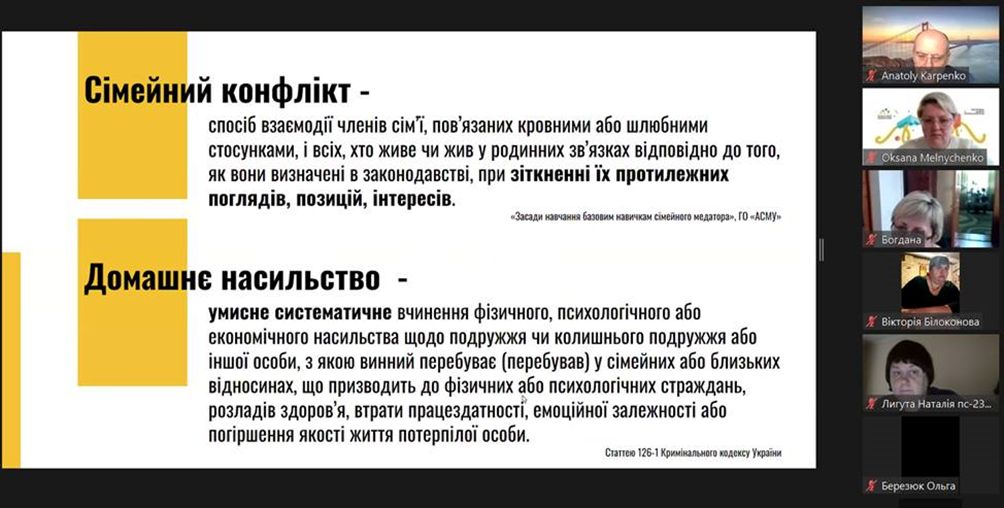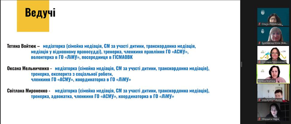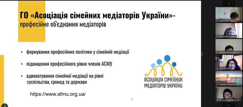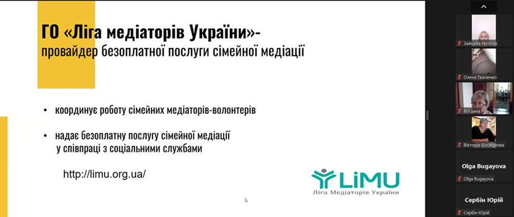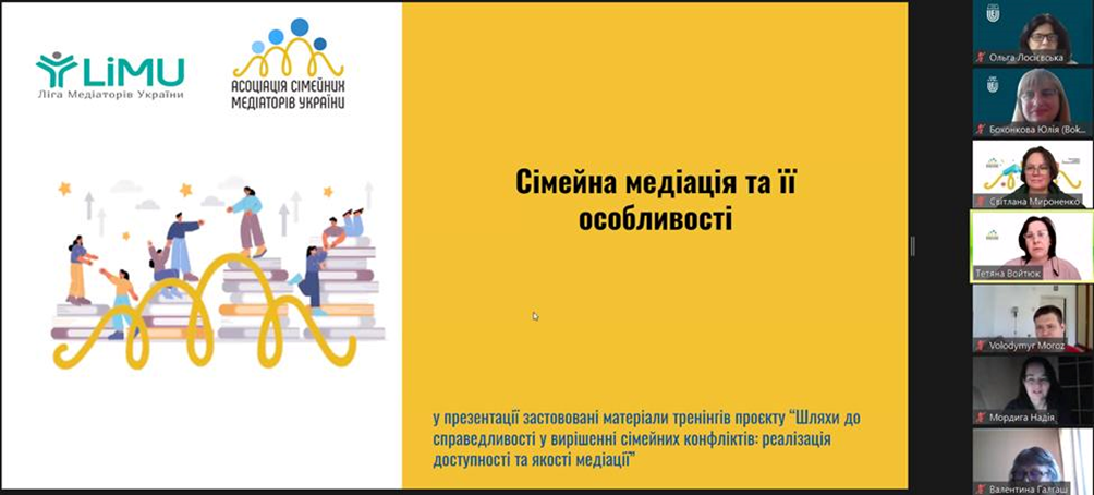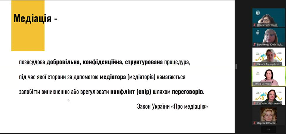 13 травня 2024 року відбулось чергове засідання Університетського центру медіації. Для здобувачів вищої освіти спеціальності 053 Психологія освітньої програми «Психологія» кафедри психології та соціології факультету здоров’я людини, на базі якої функціонує центр, та викладачів кафедри проведено вебінар на тему ""Сімейна медіація та її особливості". Мета вебінару - ознайомлення присутніх з проблемою сімейної медіації, її особливостей, а також викликів, з якими стикаються медіатори під час розв'язання конфліктів у сімейній сфері; додаткові потреби та інтереси сторін в сімейних кейсах. Ведучими вебінару виступили членкині Асоціації сімейних медіаторів України: Тетяна Войтюк (членкиня правління ГО «Асоціація сімейних медіаторів України», волонтерка ГО «Ліга медіаторів України»), Світлана Мироненко (тренерка, адвокатка, координаторка в ГО «Ліга медіаторів України»), Оксана Мельниченко (тренерка, експертка з соціальної роботи, координаторка в ГО «Ліга медіаторів України»). На вебінарі обговорювались питання комунікативної, конфліктологічної, правової компетентності сімейного медіатора. Сімейна медіація дозволяє врахувати потреби кожної сторони конфлікту; передбачає різні способи визначення потреб та бажань дитини у вирішенні питань, які її безпосередньо стосуються; націлена на пошук рішень, які влаштовують усіх учасників, та у виконанні яких вони зацікавлені; сприяє відбудові довіри та покращенню комунікації між сторонами; дає емоційну підтримку та відчуття безпечного простору. Сімейний медіатор допомагає впоратись з емоціями, налагодити конструктивну взаємодію між батьками та сприяє врахуванню потреб та інтересів дитини під час конфлікту між батьками.
