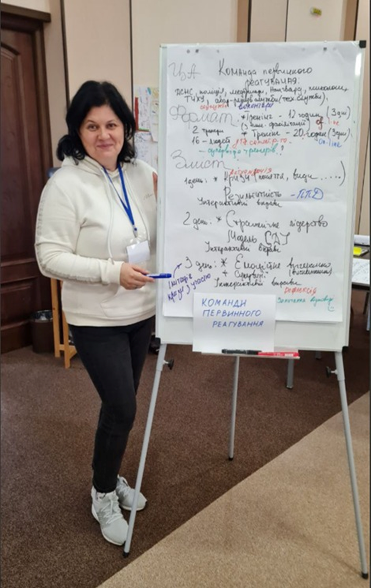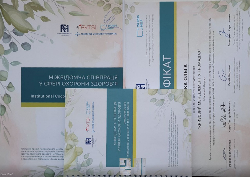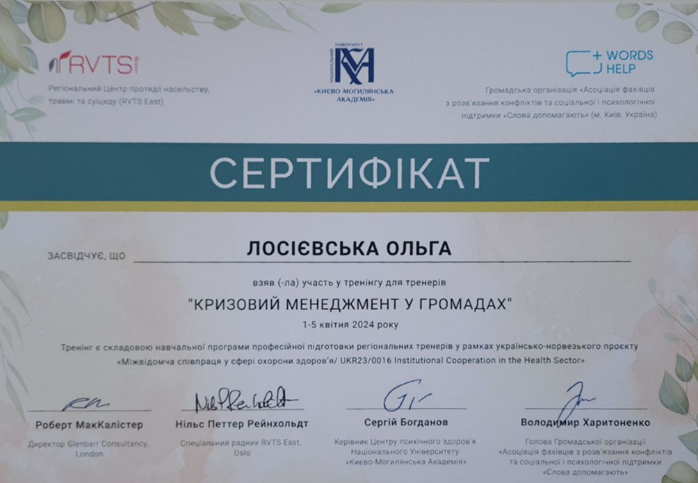 Керівниця Університетського центру медіації СНУ ім. Даля, доктор психологічних наук, професорка кафедри психології та соціології факультету здоров’я людини О. Лосієвська з 1 по 5 квітня 2024 року пройшла відбір та прийняла участь в очному 5ти денному тренінгу "Кризовий менеджмент у громадах" з підготовки регіональних тренерів з кризового менеджменту для роботи у громадах. Даний захід відбувся в рамках реалізації українсько-норвезького проєкту "Міжвідомча співпраця у сфері охорони здоров’я / UKR2303 Institutional Cooperation in the Health Sector. Підготовкою тренерів займались фахівці Центру психічного здоров'я Національного університету "Києво-Могилянська академія" у співпраці з Регіональним Центром профілактики насильства, травми і суїцидів (м. Осло, Норвегія). Зміст та програму тренінгу розроблено сумісно українськими, норвезькими та британськими фахівцями, та вже апробовано з 2020 року для цільових груп: фахівців у галузі антикризового реагування, управління персоналом, кризової та психосоціальної підтримки. Тренери проєкту: Роберт МакАлістер – сертифікований кризовий менеджер і тренер (Сполучене Королівство Великої Британії та Північної Ірландії), Нільс Петер Рейнхольд – координатор з психосоціальної підтримки, національний тренер з кризового менеджменту в надзвичайних ситуаціях Регіонального Центру профілактики насильства, травми і суїцидів (Норвегія), Оксана Бойко – тренерка з кризового менеджменту в громадах, доктор філософії з соціальної роботи Національного університету "Києво-Могилянська академія", Людмила Скиба – тренерка з кризового менеджменту в громадах, депутатка, заступниця директора КЗ «Центр надання соціальних послуг» Жовтоводської міської ради, Вікторія Соловйова – психотерапевтка, консультантка та супервізорка CETA, терапевтка з превенції суїциду та кризового менеджменту в громаді, фахівчиня центру психічного здоров’я Національного університету "Києво-Могилянська академія". Під час навчання відпрацьовувались навички з кризового менеджменту: модель CALM, стратегічне лідерство в кризових ситуаціях, самоусвідомлення й колективне усвідомлення в антикризовому управлінні: методологія та концепція SDI, стрес-менеджмент, кризові комунікації, резильєнтність громади у надзвичайних ситуаціях: піраміда втручань (IASC Guidelines), перенаправлення тощо. Дякуємо колегам з Національного університету "Києво-Могилянська академія" за надану можливість продуктивної співпраці.