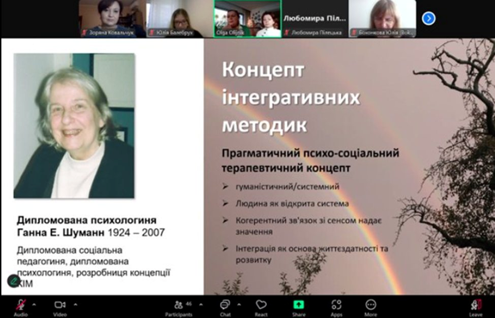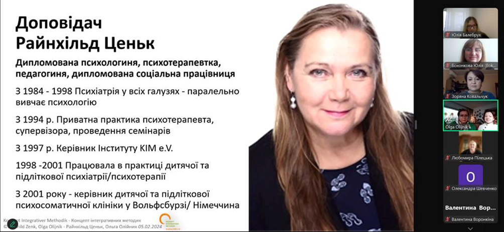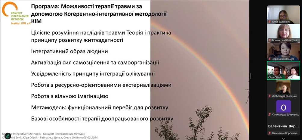 На запрошення колег-психологів із Львівського державного університету внутрішніх справ 19 лютого 2025 здобувачі-майбутні психологи разом із викладачами кафедри психології та соціології факультету здоров’я людини Східноукраїнського національного університету імені Володимира Даля відвідали лекцію німецьких колег-психотерапевтів, що працюють за методом КІМ - Райнхільд Ценьк (психолог, психотерапевт, сепервізор, директор КІМ-Інституту у м. Вольфсбург, Німеччина) та Ольги Олійник (психотерапевт, супервізор, перекладач). Педагогічно-терапевтична методика КІМ для соціального та психологічного супроводу розроблена і вперше опублікована у 1973 Ганною Елізабет Шуман, яку вона продовжувала розвивати до кінця свого життя. КІМ - салютогенна модель психосоціальної дії для підтримки процесів емансипаційних змін в окремих клієнтів або цілих груп. Крім бесіди, використовуються зображально-аналогічні, інтегративні та образні форми роботи. Інтегративний робочий процес дозволяє бачити кризову ситуацію як частину всього життя, включаючи ресурси, що підсилюють стійкість і здатність до вирішення кризи особистості.