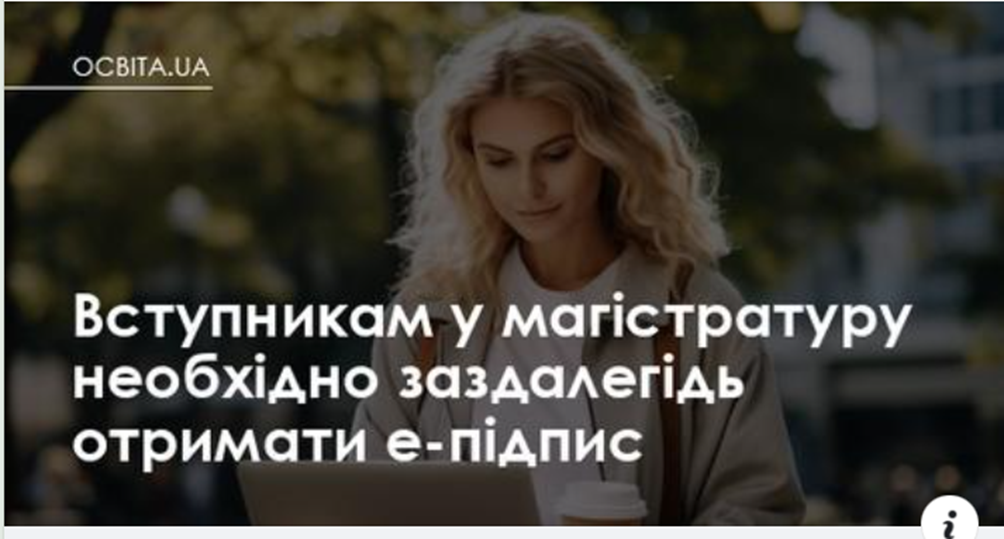 Вступникам у магістратуру необхідно заздалегідь отримати е-підпис Березень 30, 2024 Юлія Олександрівна Бохонкова Вступникам у магістратуру необхідно заздалегідь отримати е-підпис https://osvita.ua/master/91730/?fbclid=IwAR1JeL-qGun7mQCxKWLhszk9hryWOmIxRiim8onMdD5pOqB0tf4M3nKOi3w_aem_ASIW6ifU7GLWO1ITLusfTR7mw8h8QB0muU60iEQYQZTI2aY492xJdY7ZyemAimA1PuaqiGocMliC91HRsMML2X24