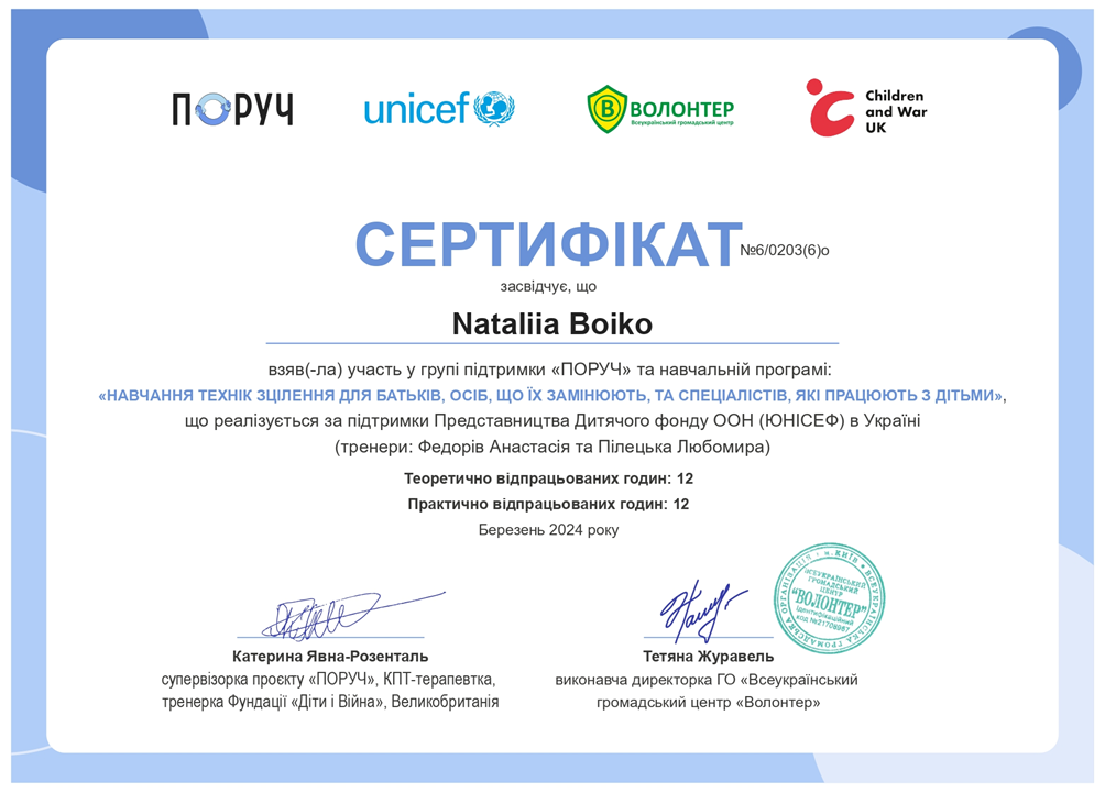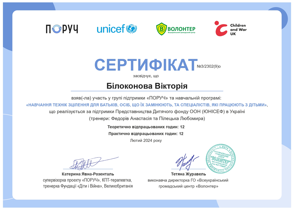 Здобувачі вищої освіти спеціальності 053 Психологія, освітньої програми «Психологія» кафедри психології та соціології факультету здоров’я людини протягом березня 2024 року взяли участь у роботі групи підтримки «Поруч» та навчальній програмі «Навчання технік зцілення для батьків, осіб, що їх замінюють, та спеціалістів, які працюють з дітьми», що реалізується за підтримки Дитячого Фонду ООН (ЮНІСЕФ) в Україні. Дитячий фонд ООН (ЮНІСЕФ) разом із Міністерством освіти і науки України, Українським інститутом когнітивно-поведінкової терапії та Всеукраїнським громадським центром «Волонтер» реалізують проєкт психологічної підтримки «ПОРУЧ».До реалізації проєкту залучені тренери з Великобританії та України. Дякуємо за запрошення прийняти участь доктору психологічних наук. професору, завідувачці кафедри соціальної психології Прикарпатського національного університету імені Василя Стефаника Любомирі Пілецькій.