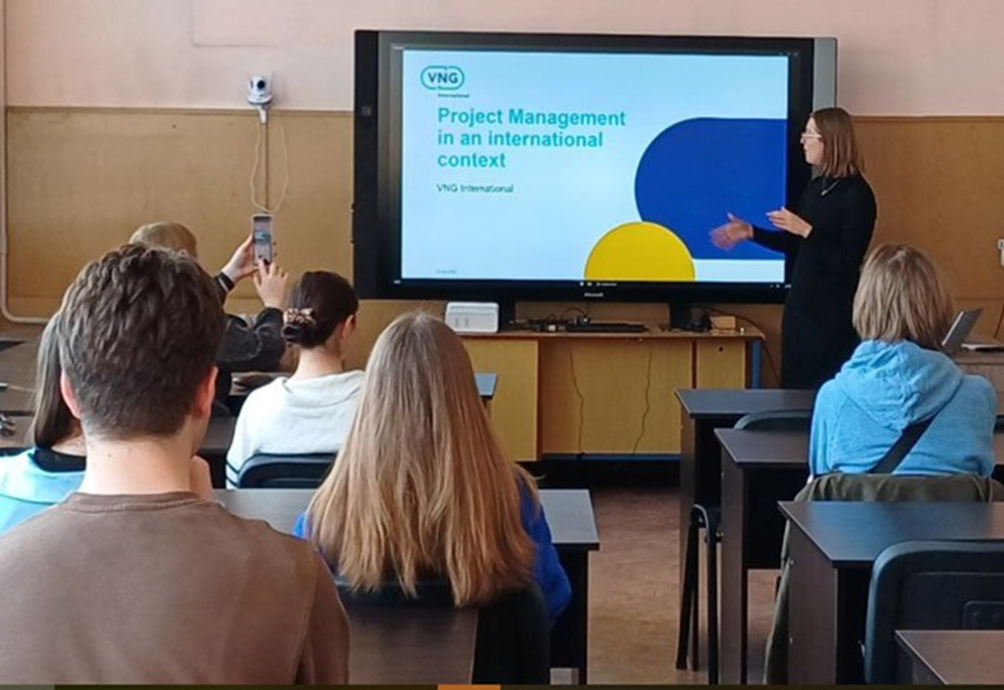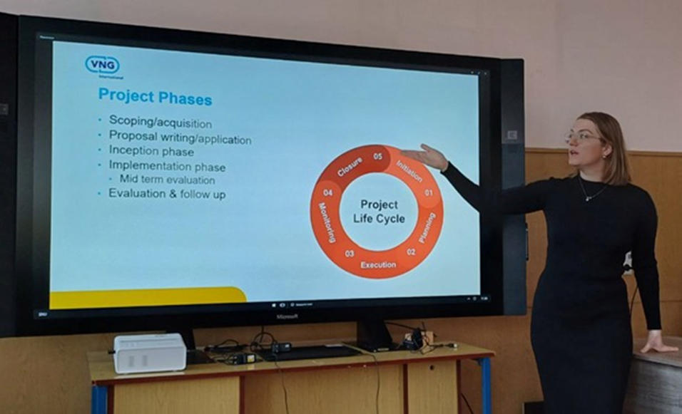 Здобувачі вищої освіти спеціальності 053 Психологія, освітньої програми «Психологія» разом із завідувачкою кафедри психології та соціології факультету здоров’я людини Східноукраїнського національного університету імені Володимира Даля Юлією Бохонковою, за запрошенням завідувачки кафедрою економіки та підприємництва факультету економіки і управління Інни Семененко взяли участь у зустрічі з представницею VNG International (Королівство Нідерланди) Флоріаною Стейнкамп – проєктною менеджеркою проєкту «Підтримка відновлення місцевого самоврядування та відбудови і реконструкції громад в Україні», що є частиною програми «Сталий розвиток через вдосконалене місцеве врядування» (SDLG), яка фінансується Міністерством закордонних справ Королівства Нідерланди. Під час зустрічі присутні дізналися більше про Агентство міжнародного співробітництва асоціації муніципалітетів Королівства Нідерланди VNG International та його діяльність у різних країнах. Зокрема, обговорили проєкт, який наразі впроваджується в Україні, метою якого є покращення якості надання послуг органами місцевого самоврядування в контексті відбудови та розвитку чотирьох українських територіальних громад, які стали цільовими громадами проєкту, – Бериславської, Високопільської, Очаківської та Херсонської. Флоріана Стейнкамп розповіла про особливості роботи проєктним менеджером: обговорили складові проєкту та його життєвий цикл, обов’язки проєктного менеджера у VNG International, а також індикатори моніторингу, що дозволяють визначити, наскільки успішними є результати проєкту. Зустріч було проведено в рамках підписаного меморандуму про взаєморозуміння між Східноукраїнським національним університетом імені Володимира Даля та VNG International в Україні.
