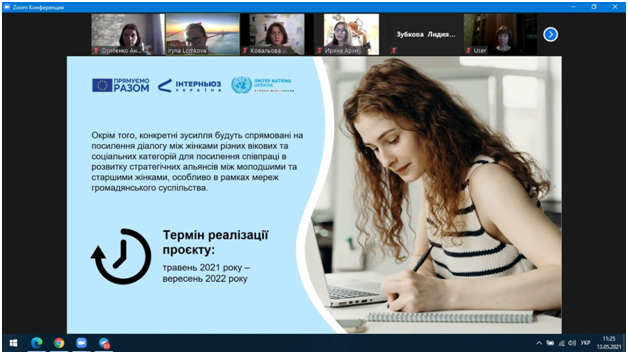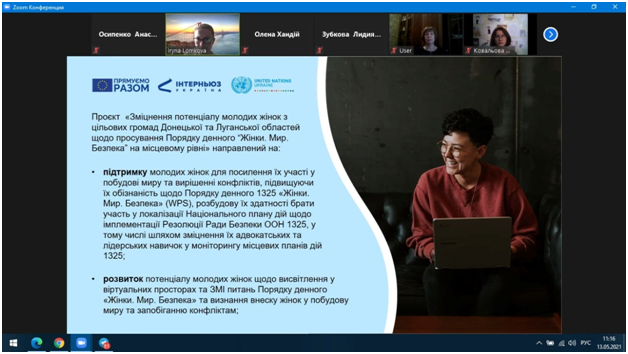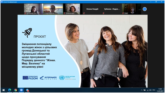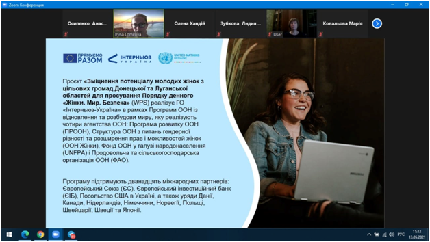 Здобувачки вищої освіти першого, третього та четвертого курсів спеціальності 053 Психологія (випускова кафедра – психології та соціології, освітня програма "Психологія") Куліш Олена, Архіпова Ірина, Ковальова Марія, Волощенко Інна, Осипенко Анастасія 13 травня 2021 року прийняли участь у презентації проєкту «Зміцнення потенціалу молодих жінок з цільових громад Донецької та Луганської областей для просування Порядку денного «Жінки. Мир. Безпека» (WPS), організаторами якої є структура ООН з питань гендерної рівності та розширення прав та можливостей жінок (ООН Жінки), фонд ООН у галузі народонаселення (UNFPA) та ГО "Інтерньюз Україна". Програму підтримують 12 міжнародних партнерів: Європейський Союз, Європейський інвестиційний банк, Посольство США в Україні, а також уряди Данії, Канади, Нідерландів, Німеччини, Норвегії, Польщі, Швейцарії, Швеції та Японії. Проєкт спрямований на посилення участі жінок у побудові миру та вирішенні конфліктів, зміцнення їх лідерських навичок та розвитку особистісного потенціалу, посилення діалогу між жінками різних вікових та соціальних категорій.